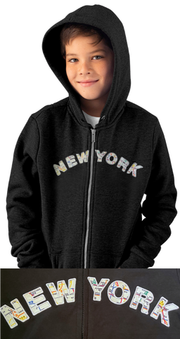 This classic zip hoodie will be in your wardrobe for years to come. A three season essential in black with white appliqué letters imprinted with the NYC subway map. Be the first to rock these!