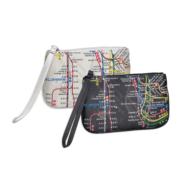 Satin Subway Map print wristlet, with one color Map lining.Inside has a 5” x 3” Zip pocket.Dimensions: 6” L x 1" W x 5" H